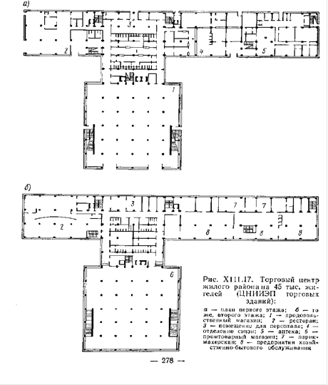 За последние годы более широкое распространение получили торговые центры. Размещение торговых центров и объемно-планировочное решение необходимо предусматривать исходя из функционального назначения, месторасположения торговых предприятий и вида товаров: товары повседневного пользования (хлеб, мясо, рыба, бакалея, молочные продукты и др.) и товары периодического пользования (промтовары, готовое платье, головные уборы, радио и фототовары, велосипеды, парфюмерия и т, п.). Товары первой группы преобладают в магазинах микрорайонов и торговых центрах жилых районов, второй - магазинах торговых центров жилых районов и городов.