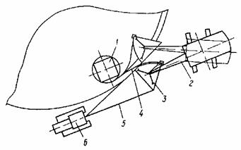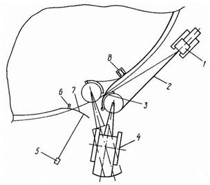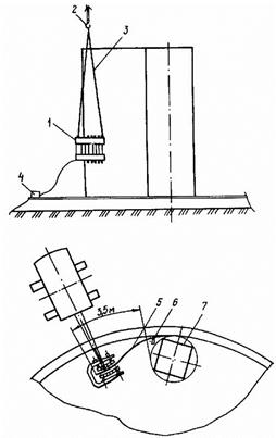 1 - рулон стенки; 2 - кран; 3 - гибочный сектор; 4 - формообразуемый участок полотнища; 5 - тяговый канат; 6 - трактор