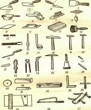 1-обыкновенная лопатка, 2-прямоугольная лопатка, 3-отрезовка, 4-стальной шпатель, 5-штукатурный ковш, 6-царапка,7-гладилка, 8-отвес массой 150кг, 9-резиновый шпатель, 10-хлопушка, 11-брусок, 12-кисть, 13-шлямбур, 14-скарпель, 15-пазовый уплотнитель, 16-ареометр, 17-рулетка длинной 2м, 18-молоток массой 600г, 19, 20-плиточные молотки массой 80 и 60г, 21-дубовый клинышек, 22-стальной резец наконечником из твердого сплава,23-24-клещи, 25-двустороняя кирочка, 26-резиновый присос, 27-28-стальные штыри, 29-карборундовый брусок, 30-карборундовый круг, 31-трехгранный брусок, 32-уровень, 33-стальной угольник, 34-шаблон, 35-шаблон А.С Афонина, 36-ножовка, 37-наколенник.