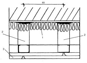 Рис. Укладка звукоизоляционного материала в пространство обрешетки: 1 — звукоизоляционный материал; 2 — обрешетка; 3 — гипсокартон