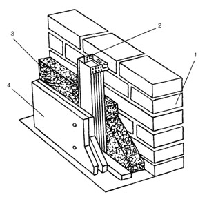 Рис. Облицовка кирпичной стены с применением потолочного профиля по технологии «Кнауф W623»: 1 — стена; 2 — ПС-профиль; 3 — утеплитель; 4 — двойная обшивка гипсокартонными листами.