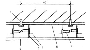 Рис. Несущий каркас на ПС-профиле без направляющих ПН-профилей: 1 — дюбель; 2 — гипсокартонная панель; 3 — несущая стойка из ПС-профиля; 4 — прямой подвес; 5 — стена; 6 — саморез
