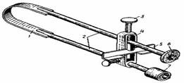 1 - пружина; 2 - металеві стержні; 3 - гвинт; 4 - повзун; 5 - обмежувач; 6 - різальний ролик; 7 - гумовий валик