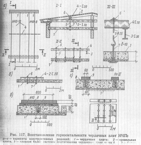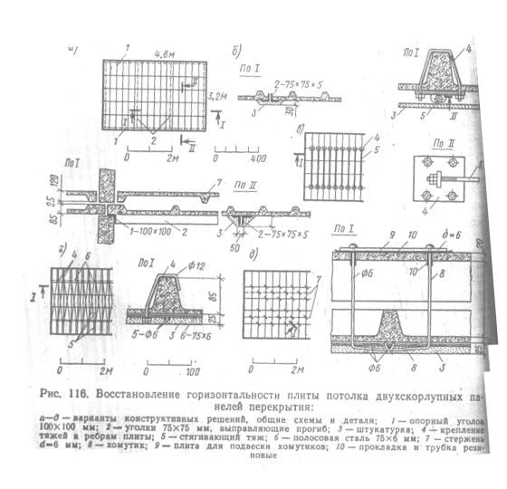 Для устранения прогиба панели потолка было предложено много различных способов. На рис. 116 показаны некоторые из этих способов, отличающихся существом инженерных решений. Предложение МНИИТЭП (С.Н. Рылло) заключается в установке поперек панели в двух местах балочек из двух уголков В75X75 мм с последующим оштукатуриванием их (рис. 116, а). С помощью таких уголков панель можно довести не только до горизонтального положения, но и несколько превысить его в средней части. Уголки приваривают к опорным уголкам 100X100 мм, вставляемым в зазор между несущей стеной и потолочной панелью. После установки таких балочек вид потолка ухудшается, сам же способ достаточно трудоемок.