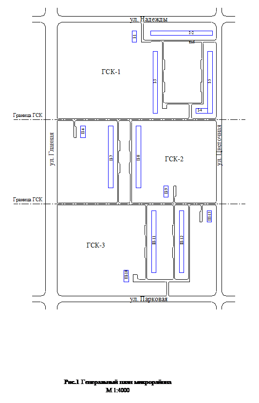 Генплан микрорайона принимаем условно и выполняем в масштабе М 1:4000 (рис. 1).