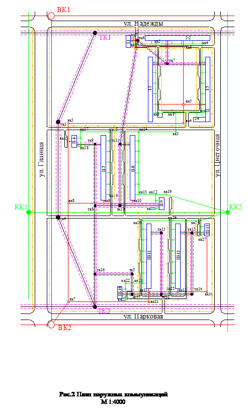 На основании генерального плана микрорайона разрабатывается план наружных коммуникаций (рис. 2) и выполняем в масштабе М 1:4000.