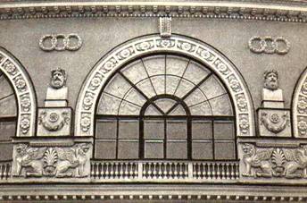 Это большой светлый зал с высоким сводчатым потолком и огромными полуциркульными окнами . В плане он повторяет мягкий изгиб галереи . Снаружи арки оконных проёмов как бы опираются на колонны галереи , образуя на фасаде единый графический рисунок . А лепной декор и мраморная скульптура , размещенная в глубине галереи , как бы сливаются с широкими аркадами , нарядными лестницами и колоннадами , написанными Гонзаго на плоскости стены .