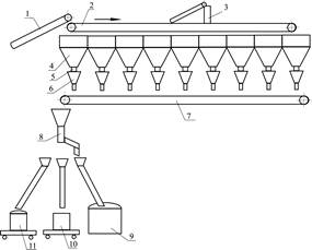 1,2,7 – конвейеры ленточные; 3 – тележка разгрузочная; 4 – бункер расходный; 5 – питатель электровибрационный; 6 – весы бункерные; 8 – течка поворотная; 9 – дуговая печь; 10 ковш на выпуске; 11 – ковш-печь.