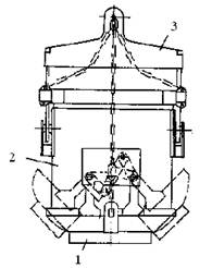 1 – челюсть; 2 – корпус бадьи; 3 – траверса; 4 – цепь; 5 – цапфа.