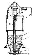 1 – пневматический двигатель; 2 – скоба; 3 – шланг для подачи сжатого воздуха; 4 – штанга; 5 – конусообразный бункер; 6 – магнезит; 7 – манжет; 8 – вращающийся диск.