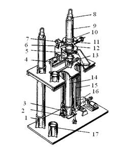 1 – гнездовой кирпич; 2 – стакан; 3 – установочная плита; 4 – направляющая каретка; 5 – верхняя рама; 6 – верхняя плита; 7 – нижняя плита; 8 – коллектор;