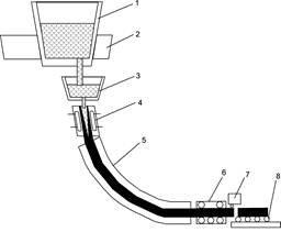 Участок ремонта ковшей размещается в специальном отапливаемом помещении рядом с главным корпусом. Разливка стали, осуществляется на МНЛЗ радиального типа (рисунок 8). Из сталеразливочного ковша 2, установленного на подъемно-поворотный стенд 1, металл заливается в промежуточный ковш 3, на котором установлены стопора для регулирования подачи металла в кристаллизатор 4. Заготовка с затвердевшей оболочкой вытягивается из кристаллизатора тянущими валками 6, проходит через поддерживающие ролики в зону вторичного охлаждения 5 и попадает на машину газовой резки 7 для порезки на мерные длины. Затем заготовки по рольгангам 8 передаются в термо-зачистное отделение.
