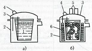 Рисунок 1. Схема установок вакуумирования в ковше: а - без принудительного перемешивания, б — с электромагнитным перемешиванием: 1 — ковш с металлом, 2 - вакуумная камера, 3 - крышка вакуумной камеры, 4 - смотровое окно, 5 - люк для раскислителей и легирующих, 6- индуктор
