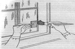 Чтобы при окрашивании оконных переплетов не пачкать краской стекла или стены при окрашивании наличников, плинтусов и полов следует пользоваться защитными щитками из кровельной стали, фанеры или картона. Две стороны у фанерных или картонных щитков надо срезать на фаску, чтобы кромки были острыми и на окрашиваемых деталях не оставались непрокрашенные кромки. При окрашивании щитки приставляют в нужное место перепло та или стены (рис.4).
