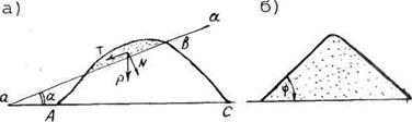 скатываться одна за другой, пока не придут в равновесие под влиянием внутреннего трения. Это движение будет происходить, естественно, без вмешательства внешних сил, и то предельное очертание, при котором прекращается движение частиц, носит название угла естественного откоса, который в сыпучем теле является углом внутреннего трения (рис. 1.1).