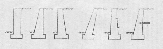 Массивная стена с двумя вертикальными гранями наиболее проста в строительстве, но наименее экономична. Наклон передней или тыльной граней стены позволяет уменьшить ее сечение в верхней части, что соответствует характеру изменения эпюр активных давлений и моментов. Стена с двумя наклонными в сторону склона гранями способствует уменьшению активного давления грунта, но она сложна в производстве.