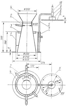 1 - цилиндрическое кольцо с фланцем в основании; 2 - конус; 3 - кольцо-держатель с ручками; 4 - загрузочная воронка; 5 - штатив; 6 - направляющая втулка; 7 - фиксирующая втулка с зажимным винтом; 8 - диск с шестью отверстиями; 9 - стальная шайба; 10 - штанга.