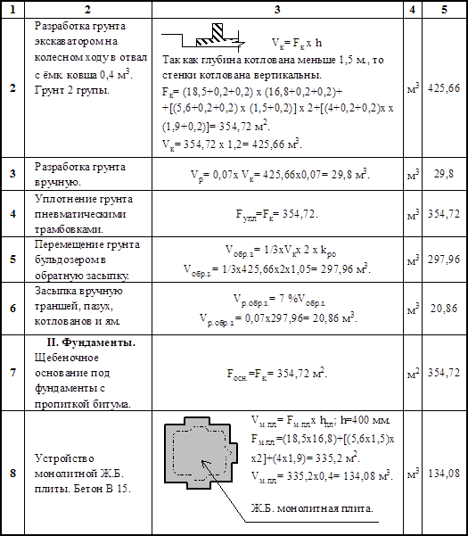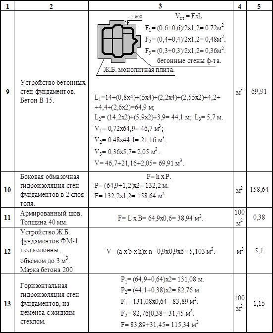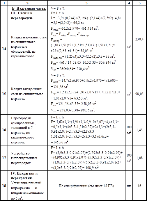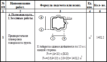 Объемы работ подсчитываются в тех единицах измерения, которые указаны в ЕНиР. Для специальных работ (сантехнических, электромонтажных и по монтажу технологического оборудования) объемы не определяются, т. к. трудовые затраты по этим работам в курсовом проекте принимаются по укрупненным показателям (1 куб. метр строительного объема или 1 кв. метр жилой площади), а в отдельных случаях - в процентах от общей трудоемкости. Все объемы работ определяются с точностью до целых чисел и заносятся в специальную ведомость.