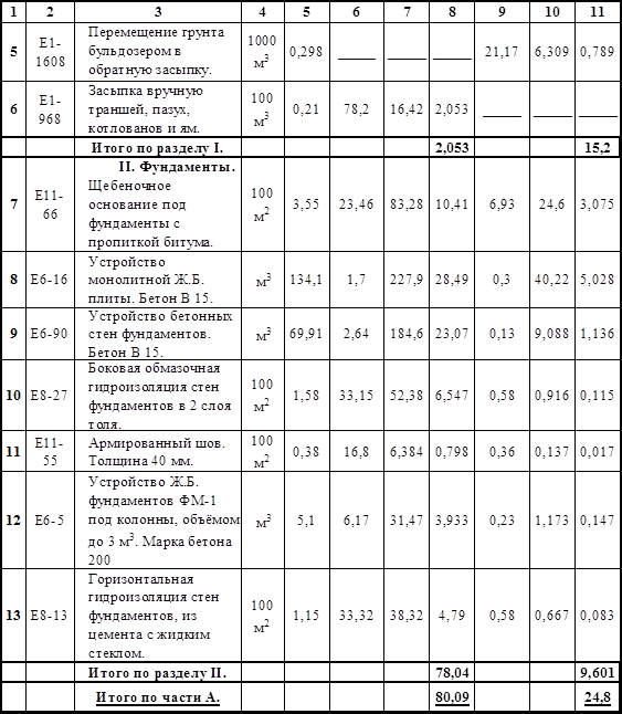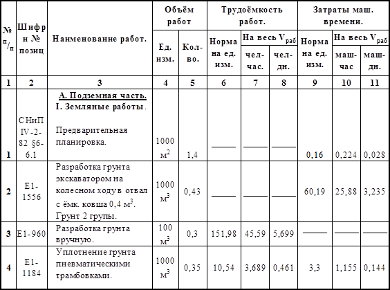 Ведомость затрат труда и машинного времени учитывает все затраты времени рабочих (в человеко-днях) и машин (в машино – сменах). Заполнение ведомости ведется по графам в установленной нумерации. При определении трудоемкости механизированных процессов необходимо учесть, что в ЕНиР норма времени на работу машин (в человеко-часах).