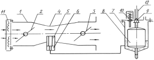 В карбюраторных двигателях к основным элементам системы питания относятся карбюратор, топливный бак с отстойником, подкачивающий насос. Рассмотрим принцип действия простейшего карбюратора (рис. 3). Карбюратор служит для приготовления горючей смеси. Карбюратор состоит из корпуса 1, воздушной заслонки 2, дроссельной (топливной) заслонки 3, диффузора 4, распылителя 5, жиклера 6, поплавковой камеры 7, поплавка 8, игольчатого клапана 9, побудителя 10 и воздушного фильтра 11.