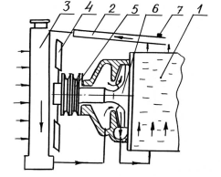 Жидкость, отводящая тепло от нагретых деталей двигателя, находится в пространстве между стенками блока и головки цилиндра, образуя так называемую рубашку 1 (рис. 4). Нагреваемая жидкость из рубашки 1 по водяному коллектору 2 отводится в радиатор 3 - специальный охладитель. Охлаждение жидкости в радиаторе 3 производится путем обдува его с помощью вентилятора 4, приводимого шкивом 5. Циркуляция жидкости в системе охлаждения обеспечивается центробежным насосом 6, находящимся на одном валу с приводом шкива 5.