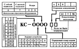 Всем моделям стреловых самоходных кранов общего назначения, выпускаемых в Российской Федерации, присваивается индекс, структурная схема которого показана на рис. 1. Первые две буквы индекса КС обозначают кран стреловой самоходный; четыре основные цифры индекса последовательно обозначают: размерную группу (грузоподъемность в т) крана, тип ходового устройства, способ подвески стрелового оборудования и порядковый номер данной модели крана.