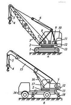 Рис. 2. Схемы стреловых самоходных кранов: а – гусеничного с гибкой подвеской стрелового оборудования; б – пневмоколесного с жесткой подвеской стрелового оборудования