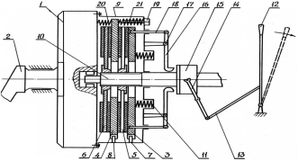 Для выключения сцепления машинист перемещает рычаг 12 на себя, усилие через тягу 13 и вилку включения 14 передается на выжимной подшипник 15, который перемещается к маховику 1 и нажимает на рычаги 16. Последние, поворачиваясь вокруг осей 17, отводят при помощи болтов 18 ведущий нажимной диск 3 от ведомого диска 5, а промежуточный ведущий диск 4 отходит от ведомых дисков 5 и 6 с помощью пружин 20 и 21.