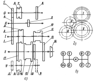 Рис. 10. Коробка передач трактора ДТ-75 М: а – кинематическая схема; б – схема взаимного расположения валов; в – положение рукоятки рычага при включении разных передач