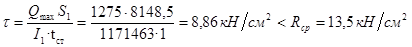 τ = QS/Itст = 1275000·11844/1792391·1 = 8425 Н/см2 = 84 МПа < Rsγc = =135 МПа.