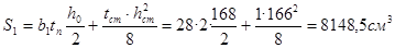 S = An·(h0/2) + (Aст/2)·(hст/4) = 100·84 + (1·166·166/2·4) = 11844 см3