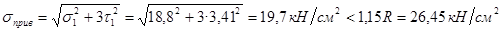Проверяем приведенные напряжения в месте изменения сечения балки (где они будут максимальны):