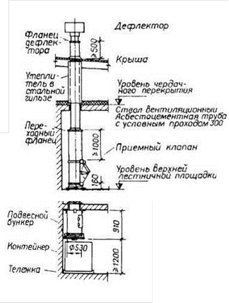 Мусоропровод состоит из: ствола с приемными клапанами, размещенными на междуэтажных площадках; возвышающегося над ними и выходящего на крышу вентиляционного ствола с дефлектором и камеры мусороудаления. В этой камере нижнее звено ствола мусоропровода на высоте от 1,2 до 2 м от пола перекрывается затвором. Пол камеры мусороудаления расположен близко к уровню спланированной вокруг здания земли - так, чтобы удобно было из нее вывозить контейнер. (см. рис.11)