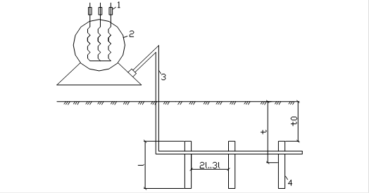 Вкачестве заземлителей приняты стальные трубы диаметром d=0,08 м и длиной l=2,5 м , распологаемые вертикально и соединенные на сварке стальной полосой 40х4 мм.