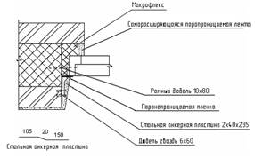 Оконные блоки в стенах крепят с помощью рамных дюбелей, анкерных пластинок. Зазоры заделывают монтажной пеной «Макрофлекс». В местах стыков прокладывается снаружи паропроницаемая, изнутри пароизоляционная пленка с покрытием из фольги. Снаружи снизу устраивают слив из оцинкованной стали.