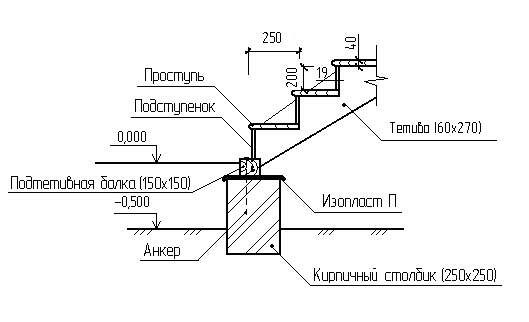 Тетива имеет толщину 60мм и опирается на подтетивную балку.