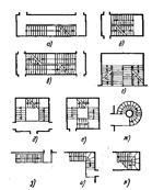 Типы лестниц: а, 6 - двухмаршевая; в - то же, с перекрещивающимися мартами; г - то же, с парадным средним маршем; д - трехмаршевая; е - четырехмаршевая; ж - винтовая; з - одномаршевая внутриквартирная; и, к-внутриквартирная с забежными ступенями. |