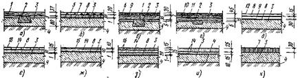 а - дощатый: б - паркетный наборный по асфальтовой стяжке; в - то же, по дощатому основанию; г - паркетный щитовой; д - из твердых ДВП; е - из керамических плиток; ж - из линолеума или плиток ПВХ; з - ксилолитовый; и - цементный или мозаичный; к - асфальтовый; 1 - доски в шпунт; 2 - антисептированная лага; 3 - бетонное или щебеночное основание; 4 - грунт, уплотненный щебнем; 5 - паркетная клепка с косыми кромками; 6 - то же, с пазом и гребнем; 7 - асфальт; 8 - битумная мастика; 9 - ДВП полутвердая; 10 - паркетный щит; 11 - лага верхнего ряда; 12 - ДВП твердая; 13 - керамические плитки; 14 - цементно-песчаный раствор; 15 - линолеум или плитки ПВХ; 16 - ксилолит.
