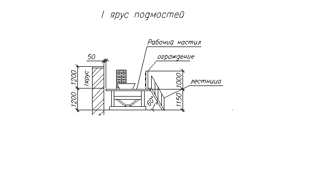 Каменную кладку ведут с междуэтажных перекрытий а с высоты 1,2м с поэтажных подмостей. Для этого производят членение на ярусы с пределом 1,2м. В проекте приведена наиболее эффективная конструкция подмостей- шарнирно-панельные размером 2,5х5,5м, там где невозможна установка инвентарных подмостей применяются неинвентарные подмости которые изготавливаются на месте. Подмости должны иметь ограждение и лестницу для подъема рабочих.