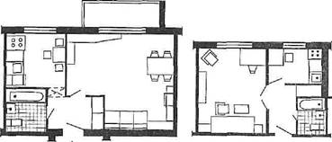 Двухкомнатные квартиры предназначены для заселения семей из двух-трех человек. Они могут иметь планировку с изолированными или смежными комнатами. Санитарный узел, как правило, раздельный. Большую комнату используют как гостиную, меньшую - как спальню (рис. 2).