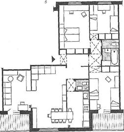 Для больших семей из четырех-шести человек предусматривают четырехкомнатные и пятикомнатные квартиры (рис. 4). Возможно расположение комнат в подобных квартирах в двух уровнях на двух верхних этажах секционных домов. Общая комната располагается смежно с передней и в удобной связи с кухней. Такую связь осуществляют через раздвижную перегородку или специальное передаточное окно в шкафу-буфете, являющемся перегородкой между комнатой и кухней. Многокомнатные квартиры ориентируются на две противоположные стороны здания (квартиры со сквозным проветриванием).