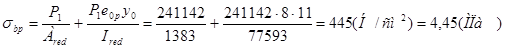 – эксцентриситет усилия Р1 относительно центра тяжести приведенного сечения: