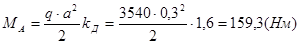 Панели поднимают за петли, расположенные на расстоянии 0,3 м от торцов. Отрицательный изгибающий момент в сечении панели по оси подъемных петель от собственного веса qc (с учетом коэффициента динамичности kd =1,6).