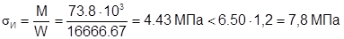 Изгибающий момент в обшивке М = Р×с/8 = 1,2×492/8 =73.8 кН×мм. Момент сопротивления обшивки шириной 1000 мм.