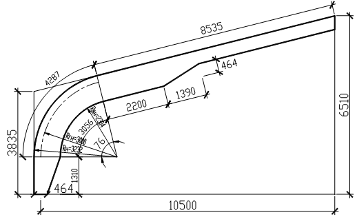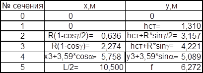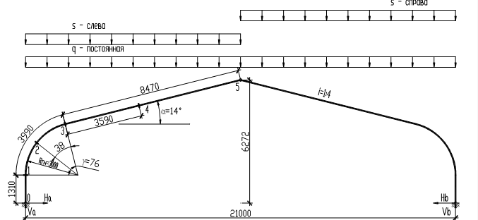 Длина полупролета 10.5 м. Радиус выгиба 3 м. Угол наклона ригеля tga=1:4=0.25; a=14о02`. Угол между осями стойки и ригеля и касательной к средней точке выгиба a1=(90о+a)/2=52о. Центральный угол выгиба в градусах 76 и радианах 1.33. Длина выгиба lгн=r*1.33=3.99 м. Длина полурамы 13.77 м.