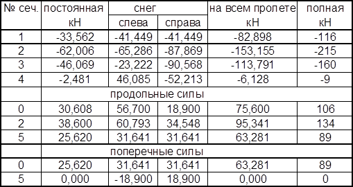 Усилия от двусторонней снеговой нагрузки равны сумме усилий от односторонних снеговых нагрузок. Усилия от собственног веса определяются умножением усилий от двухсторонней нагрузки на отношение этих нагрузок q/s=3.25/7.2=0.45. Полные расчетные усилия равны сумме усилий от двухсторонней снеговой и собственного веса.