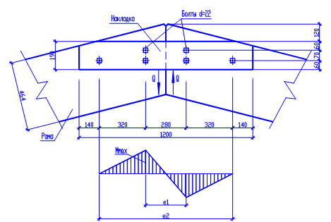 Коньковый узел решаем с помощью деревянных накладок и болтов. На накладки толщиной а=10 см действует поперечная сила от односторонней снеговой нагрузки: