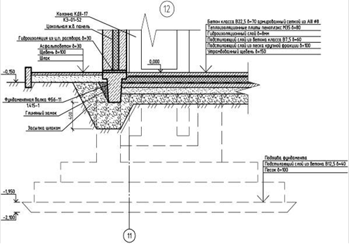 Гидроизоляция фундамента - отмостка из асфальтобетона (класса прочности В15) h = 30 мм на на уплотнённом щебне h = 100 мм. Горизонтальная гидроизоляция предусмотрена на отметке 0.000 h = 30 мм из цементно-песчаного раствора 1: 2.