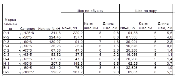 Толщина швов крепления опорного раскоса (Р-1) назначаем: на обушке 8мм, на пере 6 мм (их длины приведены в таблице 5.8.) То же для нижнего пояса (Н-1).