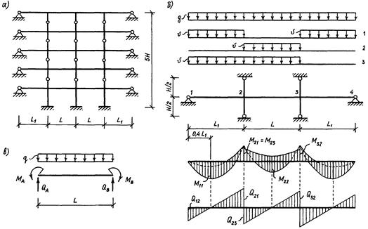 б - условная рама типового этажа, схемы её загружения и эпюры внутренних усилий;